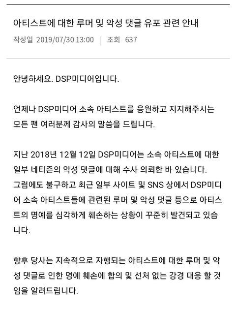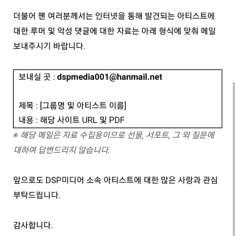 DSP미디어 아티스트에 대한 루머 및 악성 댓글 유포 관련 안내
