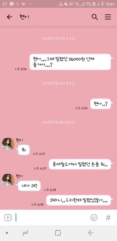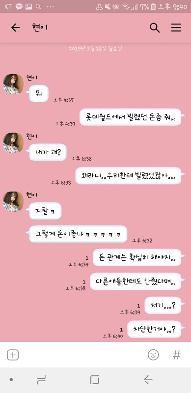 그 애랑 5학년때 같은반이 됬는데..처음에는 괜찮았어요..그런데..2학기부터 애가 완전 저를 무시도 하고 은근 까고 그러는거에요..겨울에 롯데월드를 갔을때 제가 물어봤죠 "현아 넌 왜 간식 안챙겨?" 그랬더니..."나는 내 팬들이 줄거라 괜찮아" 이러더라군요...그리고 점심먹을때 현이가 일부러 비싼거 골라놓고(후불제거든요)지갑 안가져왔다며 저하고 제 친구들한테 계산하라 하는거에요..그때 빌려줘놓고 아직도 못받고 있지만...제가 저번에 카톡으로 현아...빌렸던 돈 언제 값을거야..? 이러니깐 "지랄ㅋ"이라면서 저를 차단하는겁니다..저좀 도와주세요...닉네임은..그 애가 절 알아볼까봐...