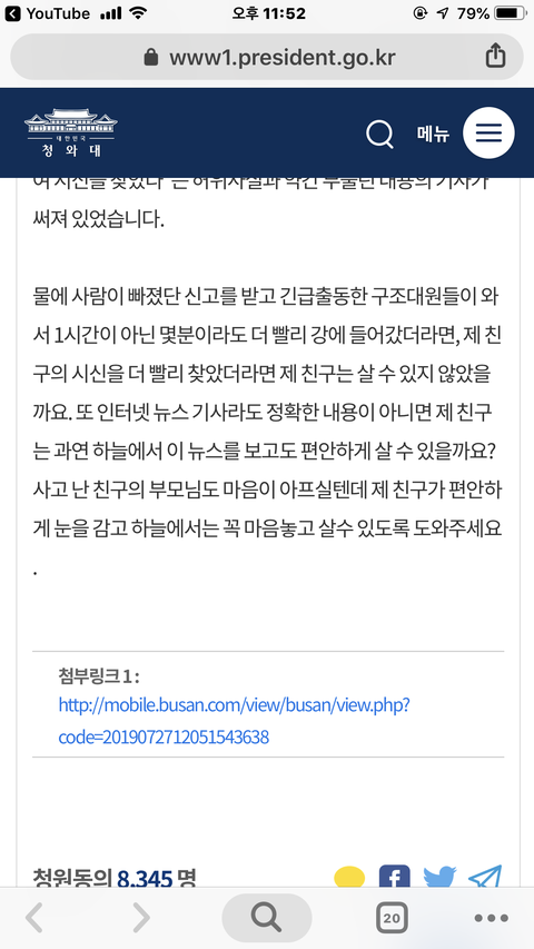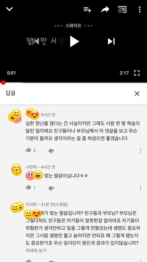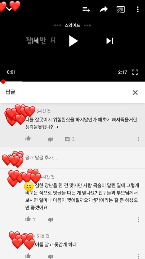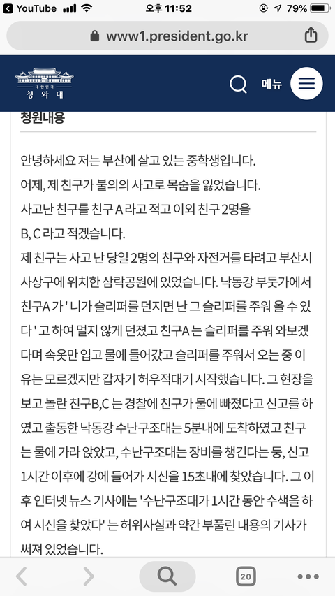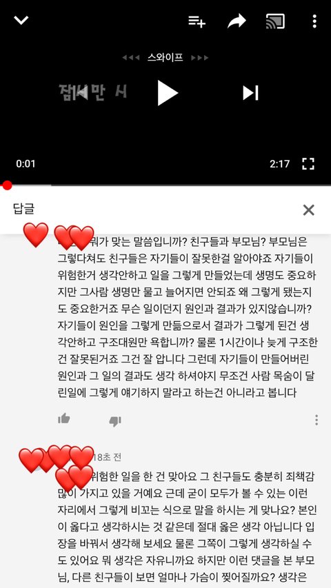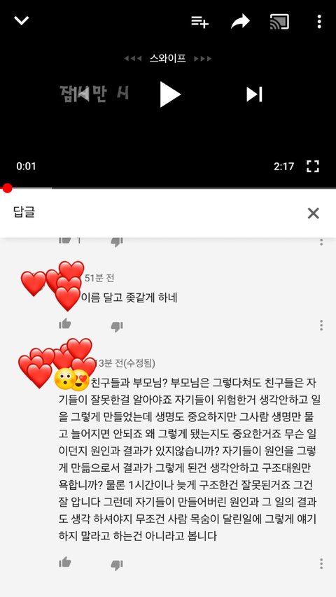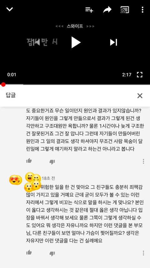 유*브 보다가 한 영상을 봤는데 내용이 대충 자기들끼리 강가에서 위험한 장난치다가 한명이 물에빠졌는데 구조대원이 1시간 늦게 구해서 죽었다고 청원해달라고 하는 영상이더라고요 근데 댓글보니까 다 구급대원들을 욕하고 있더라고요 당연히 늦게 구조한 구급대원 잘못이 있죠 근데 자기들이 위험한지 모르고 그런장난을 친 그 사람들도 잘못이 있다고 생각하거든요 그래서 제 생각을 댓글로 썻는데 한분이 제댓글에도 다른분 댓글에도 똑같이 댓글 다셨더라고요 부모님과 친구들이 이런거 보면 어떻겠냐고 입장바꿔 생각하라고 하더라고요 그래서 전 제 생각을 다시한번 정확히 얘길했는데 이런 댓글 다는건 실례라고 얘길하더라고요 여러분들은 어떻게 생각하시나요???
