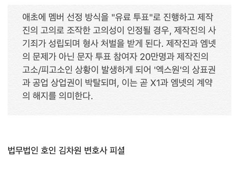이것도 변호사 개인피셜이쟎아 아니 취업비리 입학비리있음 교체하거나 부정입학자만 퇴출하지 전체를 다 퇴출한다고? 처음 11명을 투표순으로 데뷔한다는게 엑스원이면 올바른 순위를 찾아 데뷔시키는게 맞지 이것땜에 사람들이 유료투표하고 시간 노력들인건데 제작진의 일방적잘못으로 이거자체를 완전 없던일로 한다면 이거자체가 또다른 사기죄대상 모든연생들과 시청자들한테 피해보상 고소고발사유가 될꺼같은데