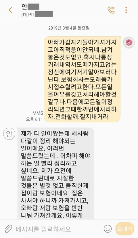 그렇게 아빠가 갑자기 떠나시고 아빠와 사이가 각별했던 엄마는 아직도 매일 매일 힘든 나날을 보내고 계시는데 아빠의 친 자녀들은 그동안 재산조회를 하고 보험조회를 하여 엄마에게 분배를 하자며 돈 얘기만을 하였습니다.