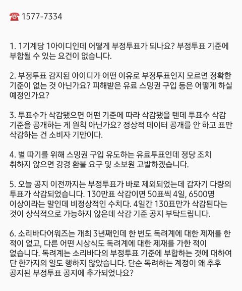 부정투표에 대한 명확한 기준도 없이 저희쪽 인기상만 130만표를 삭제하고 부정투표라 단정하고 부정투표한 계정도 비공개에 불이익,제재 조치 주지 않으며 투표를 강행하는 소리바다에게 말합니다.