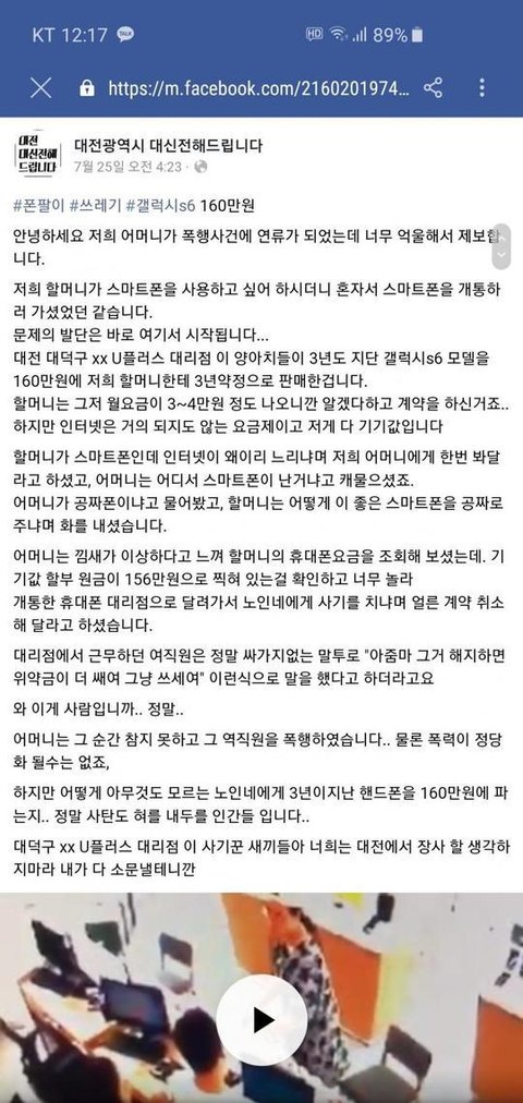 울 할머니도 저 정도는 아니지만 폰 강매 당하심. 전화로 노인분들 노리고 폰 팔이 하는 것들이 있더군요. 웃긴건 사회복지사가 그날 집에 들렀길래 이거 괜찮은 거냐 물어보니까 하라고 했다네요. 어이없음. 90 다되신 할머니가 무슨 스마트폰이냐고요. 전화도 겨우 거시는데 죽여버리고 싶음. 해지 절대 안 된다고 개진상 떨더만. 폭력은 나쁘지만 죽빵 날리는 거 이해가 감