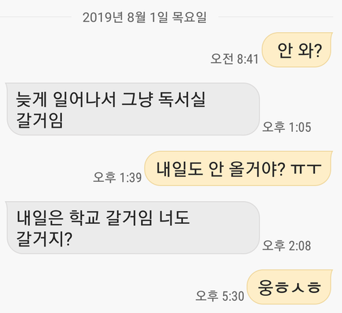 그냥 평범한 문자이긴 한데 짝녀가 두 번째로 보낸 문자 온 순간 심쿵했다 ㅋㅋㅋㅋㅋ ㅠㅠ 넘 조아 짝녀 엄청 조용하고 무뚝뚝한데 저렇게 보내준다는 거 자체가 넘 좋아
