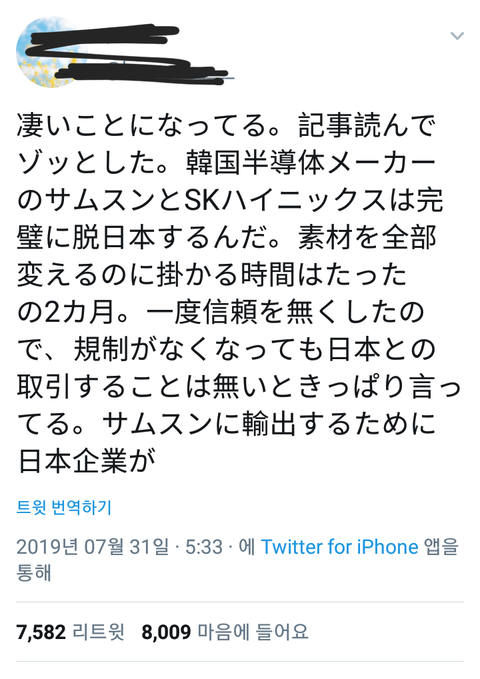 지금 실제로 8000명 이상 공감받고 있는 한 일본인 트윗을 다 가져오지는 못했지만 중심적인 내용을 보면 삼성이나 하이닉스등 아베의 어리석은 경제보복과 백색국가 제외로 일본 중소기업 피해가 많다고 일본인들 조차 아베정권 규탄함. 또 한국이 일본제품으로부터 스스로 독립화 되어간다며 큰일이라고 우려함.