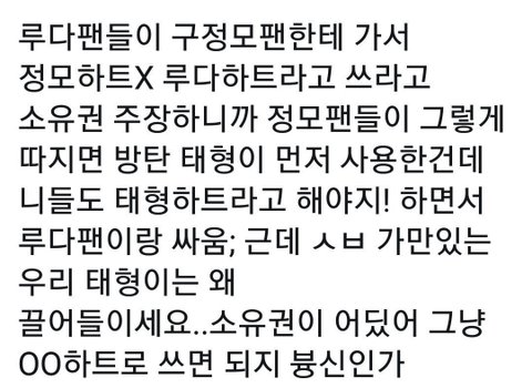 상황 설명 : 정모 팬들이 "정모하트" 라고 하자 루다 팬들이 "루다하트라고 해주세요!" 라고 함 이에 정모팬들이 "시초가 방탄 뷔인데 그럼 태형하트라고 해야 하는 거 아니냐" 라고 반박 제기, 이에 점차 아미들이 알게 되어 판이 커짐