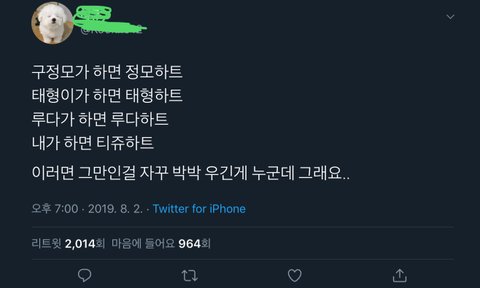 +))) 댓글 몇 명 오해를 하는 것 같은데 난 분명 "아미는 태형하트라고 쓰라고 주장했다" 라고 한 적 없어. 아미 입장은 "태형이가 먼저 썼는데 웬 소유권 주장이냐" "그냥 oo하트라고 부르면 안되냐" 라는 거야. 댓글 달 거면 제발 글 좀 제대로 읽어주라