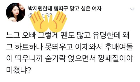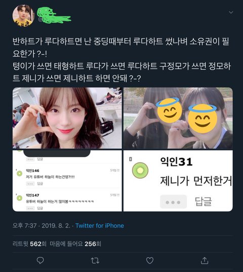 개인적인 의견을 덧붙이자면, 자신의 독창적인 하트를 꼭 유명하게 만들어야 할 필요가 있는 걸까 싶다. 하트는 기본적으로 팬들을 위해 하는 것이지 않나... 먼저 사용하던 우리 집에 어느날 갑자기 문 쳐부수고 들어와선 소유권 주장한 당신들이 더 깡패짓하는 거라고 생각한다. 소유권 주장도 모자라 계속 "느그옵" 이라는 워딩을 써가며 폭언질까지...