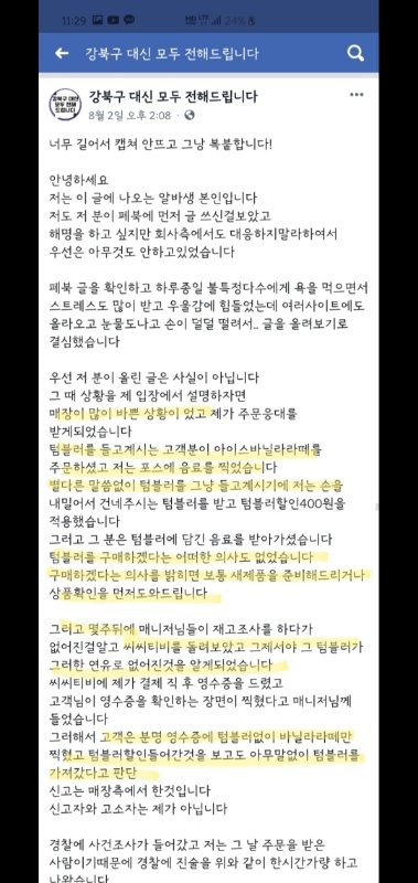 6. 기자들이 카페측에 당시 상황에 대해 묻자 고객이 새상품의 포장들 다뜯어서 가지고왔기 때문에 고객소유의 텀블러를 가져온것이라 착각했다. 이렇게 얘기했으나 매장매니저와의 통화에서 내가 언제 그랬느냐 CCTV에 그장면이 어디있냐 그런장면 어디에도 없고 난 전시된거 그대로가지고가서 사겠다고 했는데 왜말지어내느냐라고 묻자 이것에 대해선 변명하지 못했다. 자기는 그렇게 말한적 없다며 발뺌.