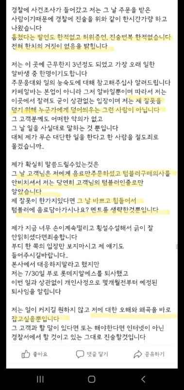 8. 직원은 현시각까지도 허위증언,진술번복, 한치의 거짓이 없다고 하는데 제가볼땐 한치의 진실도 없습니다. 절도하지 않은 사람을 절도로 신고하기 위한 증언으로, '그 손님이 계산하지 않고 그냥 가져갔다.' 라고 이야기한것자체가 허위증언입니다. 그리고 번복한것은 처음부터 손님이 자기텀블러들고온줄 착각해서 내가 음료값만 찍었다. 라고 얘기했어야 했다는 겁니다. 하지만 처음엔 그런얘기는 없었습니다.
