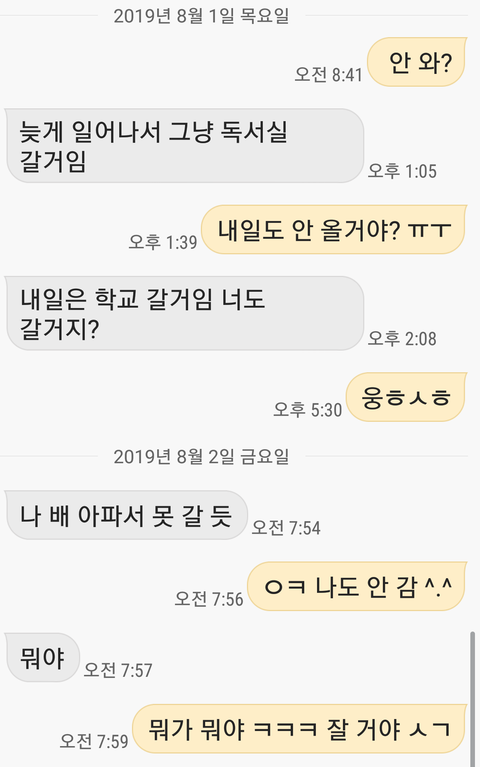 이건 내가 얘가 학교 보충 날에 안 나왔길래 물었을 때 문자... ㅠㅠ 얘 성격 엄청 무뚝뚝하고 다른 친구들이 전화하면 ㅈㄴ 심드렁한 목소리로 답한다는데 나한테는 너도 올 거지? 하는 거 보고 개 심쿵함 별 거 아니긴 한데 ㅠㅠ