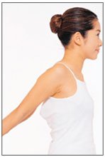 팔을 들어 어깨 뒤로 넘긴 뒤 한쪽 팔로 다른쪽 팔꿈치를 잡고 뒤로 당긴다. 번갈아 반복한다. 어깨부터 등까지 쭉 펴주는 효과가 있다.
