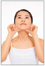 엄지손가락을 턱에 받친 뒤 손가락 은 턱을 밀고 머리는 숙이려 한다. 힘이 서로 엇갈리게 되면서 목뒤 군살을 제거해준다.