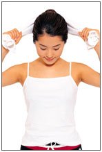 수건을 팽팽하게 잡아당긴 뒤 머리 뒷부분에 대고 고개를 앞으로 젖힌다. 고개를 굽히지 않고 쭉 펴면서 숙이면 앞부분의 군살을 없앨 수 있다.