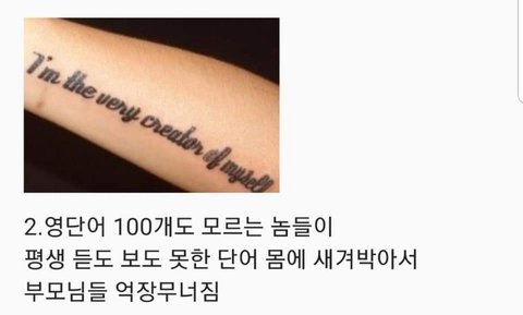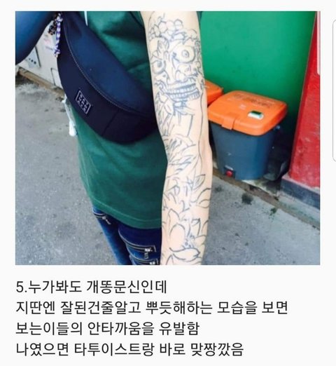 ㅋㅋㅋㅋㅋㅋㅋㅋ개인적으로 문신에 색깔칠하던 말던 각자취존이니 관심은 없는데 진짜 보는거 완전 기분상하다 싶다면 그 사람한테 스케치북이랑 크레파스 주고싶음 니 몸에 그리지말고 스케치북에다가 그리라곸ㅋㅋㅋㅋㅋㅋㅋㅋㅋㅋㅋ