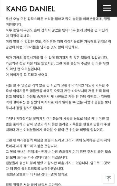 우선 나는 강다니엘을 프듀시절부터 좋아했고 좋아하고 있어. 지금 마음이 좀 뒤숭숭한데 내 주변에 다녤팬들이 없어서 이 글을 써. 지극히 주관적인 내 생각이고 두서없지만 그냥 가볍게 들어줬으면 좋겠어.