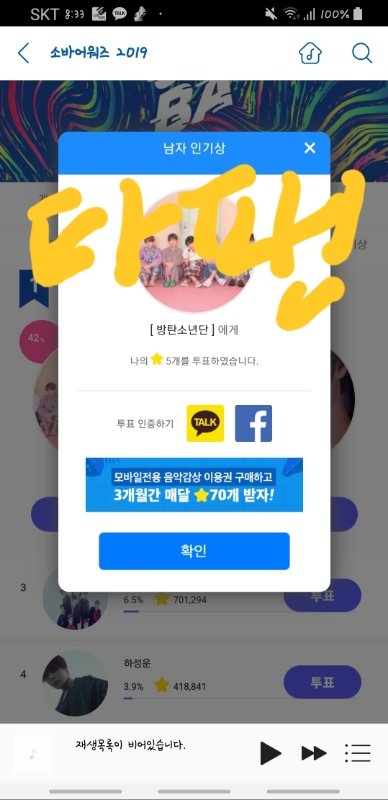 동생이 방탄 팬이기도 하고 내 본진이랑 친하게 지내는게 보기 좋아서 오늘부터 투표해줄게! 진작 알았으면 투표해주는건데 늦게 알았다ㅠㅜ 인기상 꼭 받았으면 좋겠다! 파이팅!!
