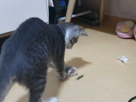 최근에는 방아깨비, 메뚜기, 지렁이, 개구리 등을 잡아와서 집사는 조금 난감하고 무섭기도하고 그래요.....