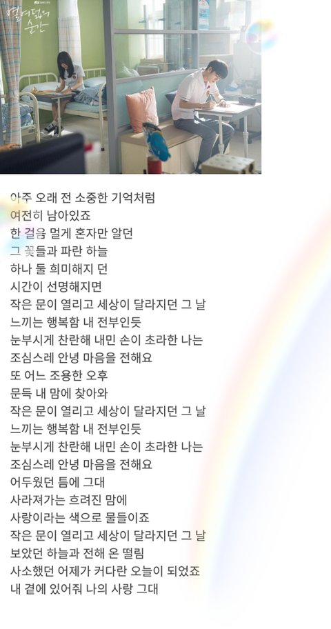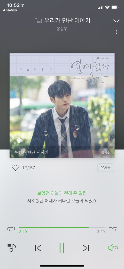 옹성우가 부른 열여덟의 순간 오스트 '우리가 만난 이야기' 많이 들어주라 노래 너무 조아 가사도 이쁘고 감성적인 곡이야 우유커플 나올때 흐르는 곡인데 주누가 수빈에게 조심스레 마음을 전하는 세레나데곡이래..