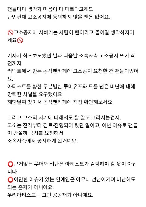 커넥트를 통해 공식으로 나온 고소공지는 팬들이 원했던거라는거 그리고 그전부터 이미 고소고발에 관한 컨택은 꾸준히 진행되어왔다는 점 또한 한번 더 짚고갈께