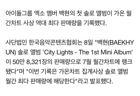 이와중에 백현, 7월 50만장 넘겼다..가온 월간 최다 판매량 경신