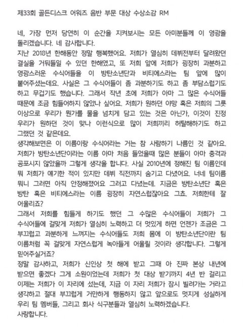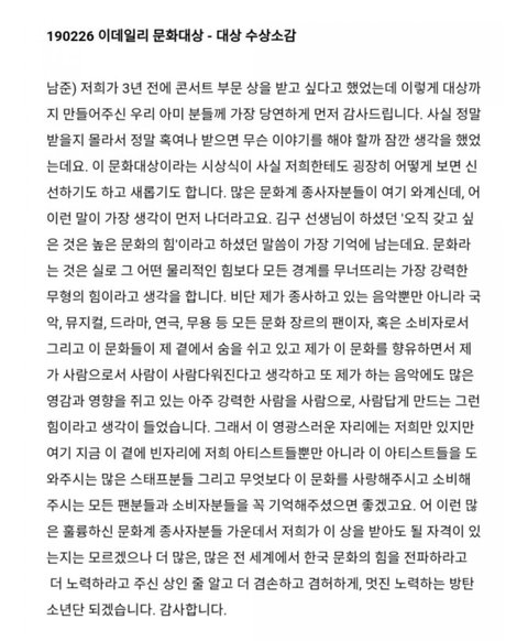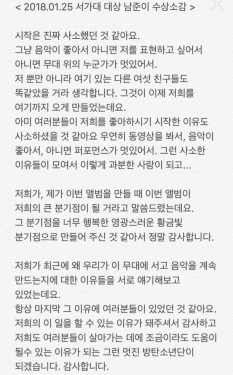 한번도 같거나 비슷한 수상소감이 없음...RM 이 정도면 명언어록으로 책한권 내야되지않나멤버들이 다 정말 생각이 깊고 영상보면 무대가 아닌 곳에서도 진심으로팬을 위한다는걸 팬이 아닌 사람이봐도 느껴짐..ㄷㄷ방탄 팬들은 좋겟다 가수한테 이렇게나 사랑 듬뿍듬뿍 받아서~ ㅠ