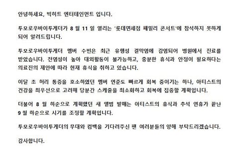 txt 연준 수빈 아파서 컴백 연기
