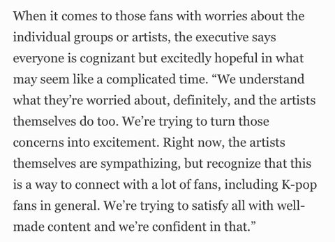 "팬들의 걱정은 잘 알고 있고 아티스트들도 나름대로 걱정을 하고 있지만 이런 걱정을 기대로 바꿀 것이다." 라는 뉘앙스로도 말함.