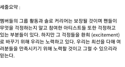 가수 개인과 그룹을 걱정하는 팬들의 우려에 대해서는 모두가 충분히 인지하고 있으며 복잡한 시점이지만 희망적으로 생각하고 있다고 대답했다.