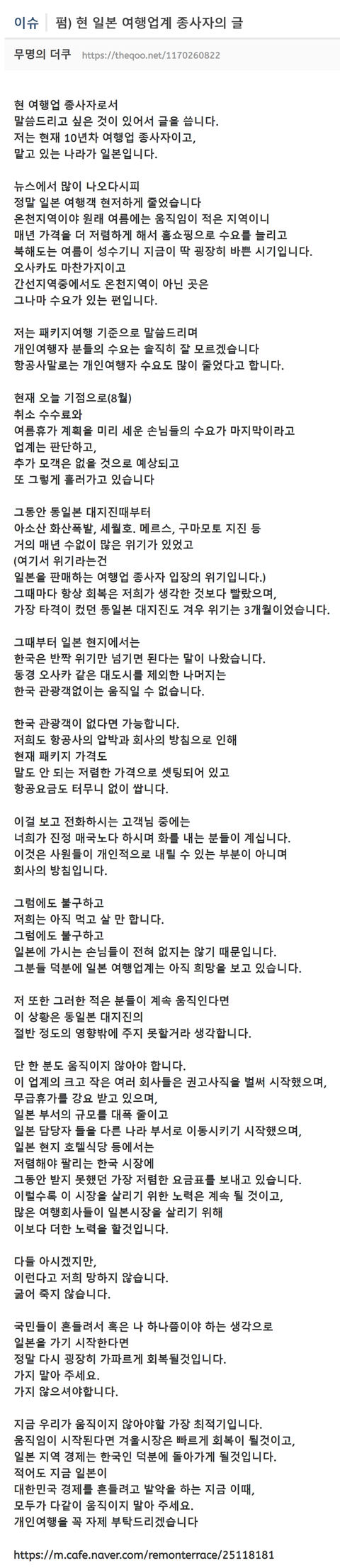 왜 이번에 대한항공 직원들이 일본행 티켓 죄다 90% 정도 할인된 가격으로 샀다는 기사 있었잖아 ㅋㅋㅋㅋ 이게 여행갈 기회라면서 항공 직원들이 지인들것까지 티켓 산다는 ㅋㅋㅋㅋㅋ 멀었어 진짜 불매가 강압적이면 안되는 것도 맞고, 극단적이면 안되는 것도 맞지만, 이걸 기회로 더 이용해 먹으려는 애들은 진짜...ㅋㅋ