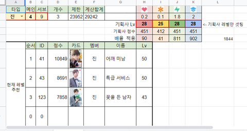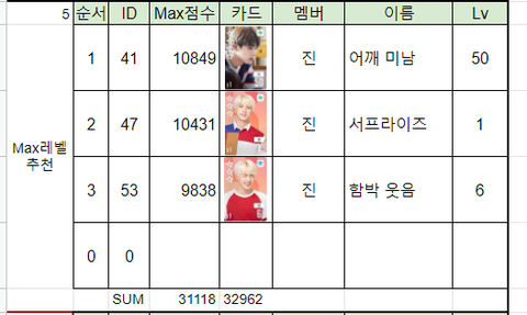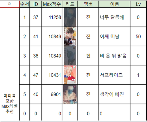 2) 카드는 가지고 있지만 아직 키우지 않은 카드의 레벨을 MAX로 찍었을 때 추천과