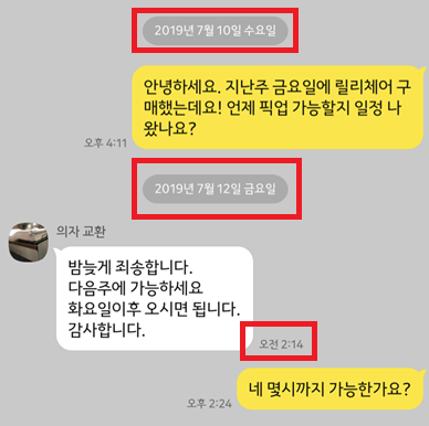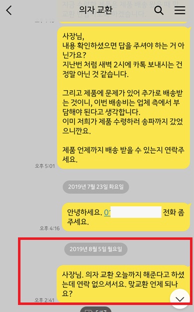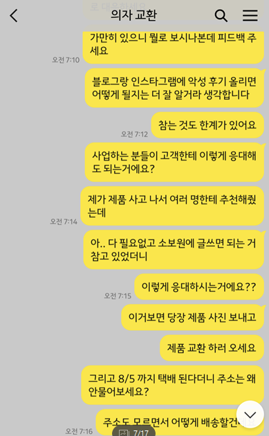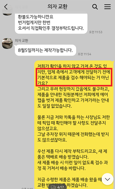 1차로 남친이 했을 때 연락이 안되서, 다음달 전화 달라고 하니 전화가 왔어요.통화로는 제품에 하자가 있으면 당연히 교환해주겠다고 하여, 저는 꾹 참으며 업체 측에서 제시했던 기간을 생각해 2주 뒤 맞교환 해달라고 했습니다.