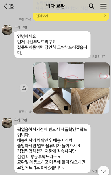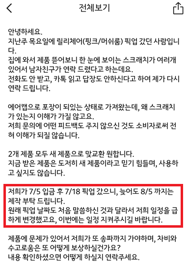 송파에서 차로 1시간 거리인 집에 도착해 제품을 보니 스크래치가 있는, 누가 봐도 새 상품이 아니였어요. 힘들게 가져왔는데 제품이 찍혀 있으니 저도 많이 속상했지만, 정중하게 교환해달라고 연락 했습니다.