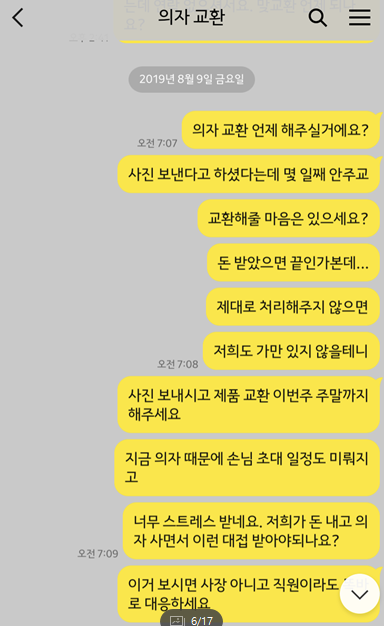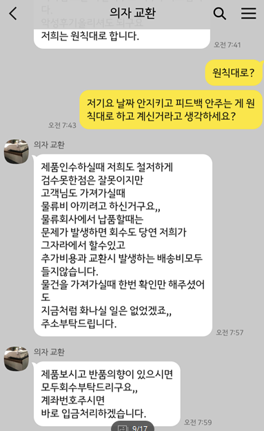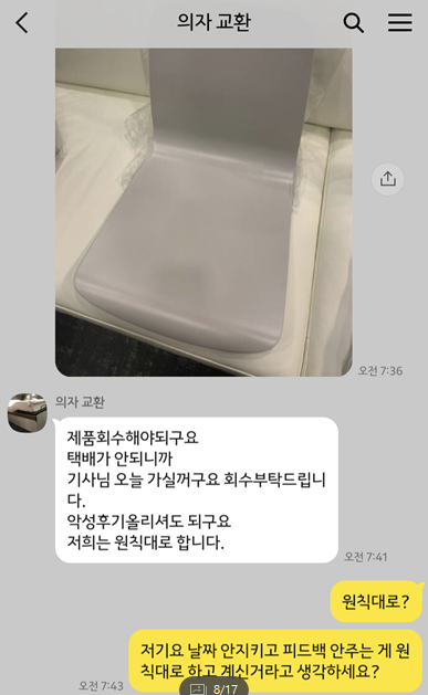 미X리라는 업체입니다, 송파가구단지에 사무실을 두고 있으니 주의하세요!!! 의자 때문에 이런 스트레스를 받게 될 줄 몰랐습니다. 저도 회사에서 일하면서 업체 상대하지만 이렇게 입금 전/후가 다른 경우는 처음입니다.