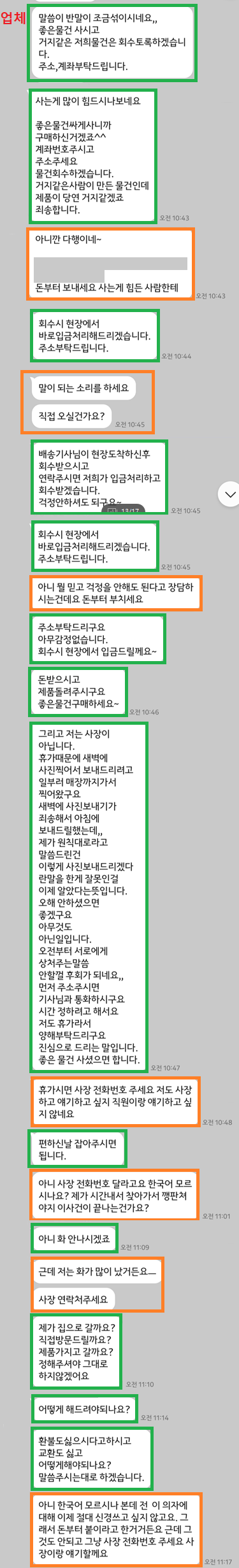 이 글을 쓰면서도 괜히 몇 푼 아끼려다 구매 시스템이 잘 되지 않는 곳에서 이게 무슨 X 고생인가 싶더라고요.결국 남친에게 말했고, 그 다음이 더 가관입니다.남친폰이 보안 관련해서 캡쳐가 되질 않아, 주고 받은 문자를 저한테 보내줬어요.초록색이 업체, 주황색이 남친입니다.