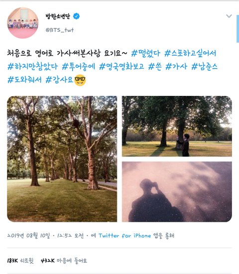 오늘 새벽에 방탄 트위터에 뷔 자작곡이 올라왔는데 노래가 너무 좋아서 아미들 잠 다 깨고 폭발함. 노래 제목은 WinterBear. 심지어 그냥 음성이 아니라 뷔가 찍은 영상들까지 편집해서 한 편의 뮤비가 나옴.