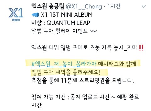 이 해시랑 같이 앨범 구매 내역 캡쳐해서 올리면 추첨 11명한테 스밍권 줌