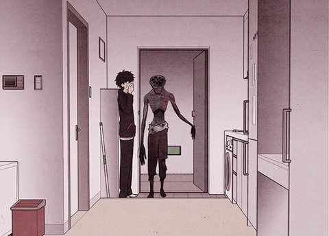 대강의 내용을 말하자면 가족을 교통사고로 잃고 함께 살던 집에서 작은 오피스텔로 이사오면서 기괴한 일들이 일어나게 되고 사람들이 알 수 없는 생명체(?)로 변해가면서 남아 있는 사람들끼리 생존해가는 이야기를 다룬 웹툰ㅇㅇ