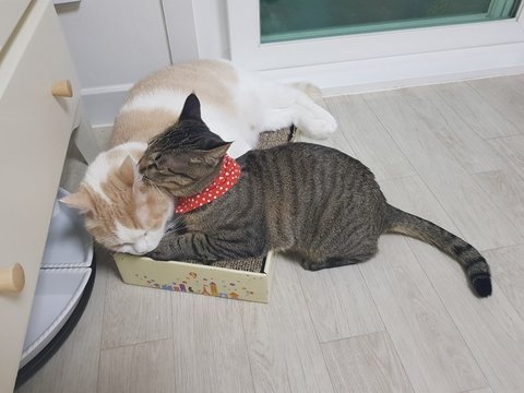 치카가 나의 새집을 탐내길래 한번 들어가게 해주었다옹.