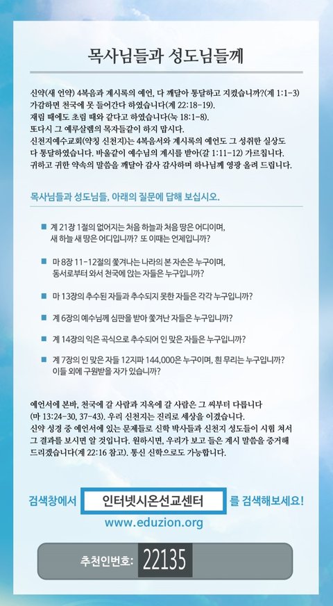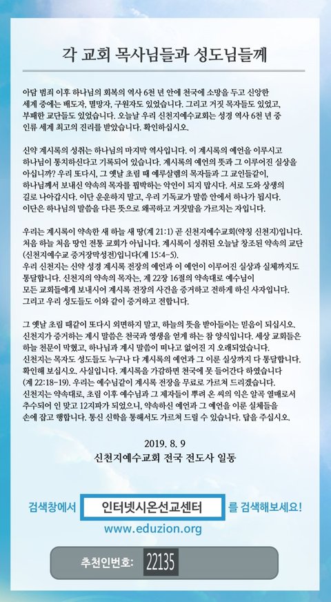 신천지 예수교회에서 각 교회 목사님들과 성도님들께 편지를 전달하고자 합니다.