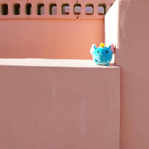 여행갔을 때 코끼리 인형 핑크색 담벼락에 놓고