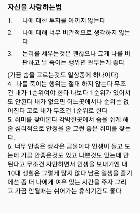 요즘 인생 살아가면서 많은 생각이 들었어 부정적인 생각도 되고 안될때마다 나를 깎아 내리면서 모든 무조건 내가 하는 일에서 나보다 그일이 먼저였고 내가 바닥 까지 갔다고 느낄때 비로소 느낀걸 여기에 공유해 너네도 나같은애가 혹여나 있을까 이글 보면서 좀 더 힘내라고 보여주고 싶었어 지금 힘든 이순간에도 무조건 빨간불 초록불만 있는거 아니니깐 나같은 애가 있다면 지금 잠깐 노란불이 있다고 생각하고 나에게 휴식기를 주자 그리고 우리 같이 좋은길로 극복해내자