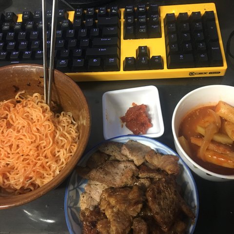 엄마랑 싸우고 아무것도 안 머것는데 배고파서 ㅎㅎㅎ 비빔면이랑 목살이랑 갈비랑 떠뽀기 ㅎㅎㅎㅎㅎㅎㅎㅅ 하앙
