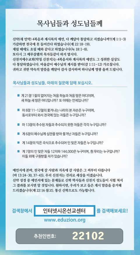 여러분은 신약 계시록에 대해 얼마나 알고 계신가요?이에 신천지 예수교회에서 각 교회 목사님들과 성도님들께 편지를 전달하고자 합니다.아래 편지글 보시고 깨달으시길 간절히 소망하겠습니다.,