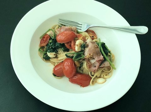 집에있는 시금치 토마토 베이컨으로 만든 파스타