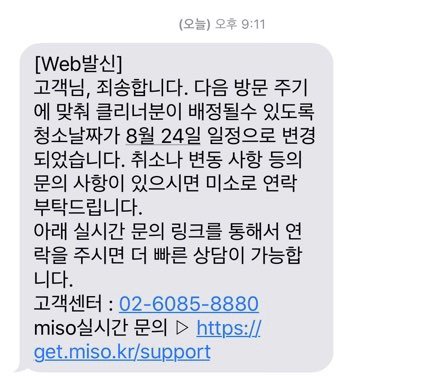 그런데 내일(토) 오전 10시에 청소 예약이 되어 있었는데, 오늘 오후 7시가 넘어서 일방적으로 청소를 갈 수 없다고 문자가 오고... 고객과 상의도 없이 9시가 넘어서 다음주 토요일로 미루어졌다고 문자가 왔네요.