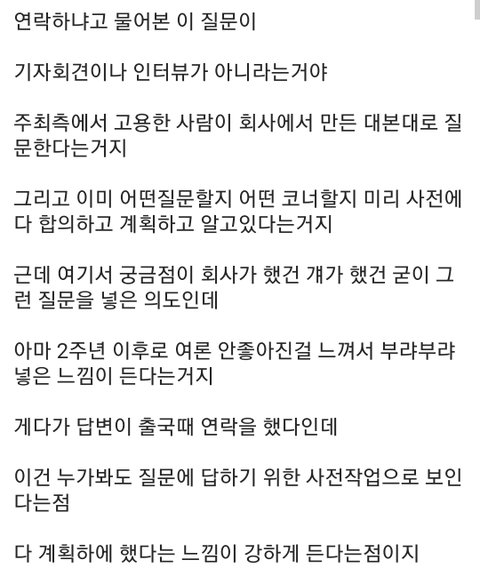 먼저 원글 쓰니한테는 미안 아래 베댓 반박 댓글인 점 참고해줘 // 보통은 대본대로 하지만 워너원 연락, 두리안, 팬클럽이름은 mc분께서 임의로 질문 했다고 인별에 남겼어 공연 끝나고 엠씨분이 미안하다고 즉흥 질문에 사과했고 다니엘은 오히려 괜찮다고 말했고 ㅇㅇ