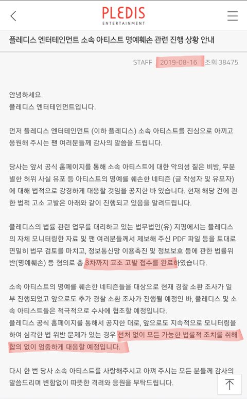 ❤플레디스소속 아티스트 명예훼손 관련 공지(19.08.16)