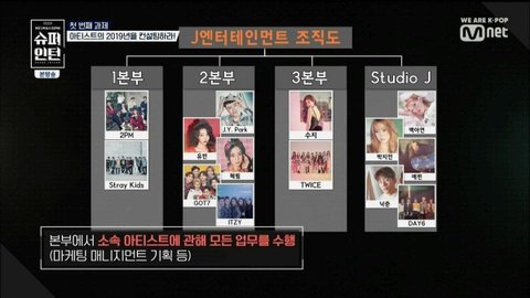 1본부- 투피엠, 스키즈2본부-갓세븐, 있지,유빈,혜림,박떡고3본부-트와이스,수지스튜디오제이-데이식스,백아연,박지민,백예린,낙준(버나드박)