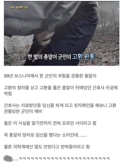 ㅋㅋㅋㅋ 수영장에서 정자 떠다니는거 걸려서 임신 했다는거 보다 더 황당함. ㅋㅋㅋㅋㅋ